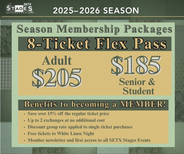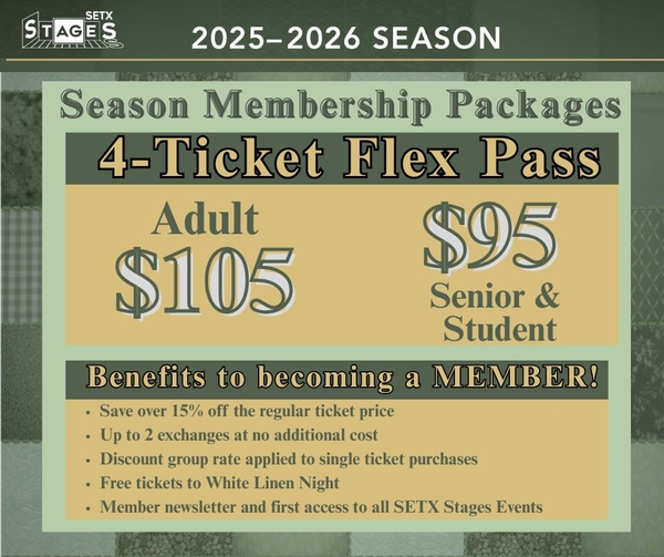 Our season features a dynamic lineup of performances, from powerful dramas to crowd-pleasing musicals and more. Don’t miss this chance to experience the magic of live theater with ultimate flexibility. Get your 4-Ticket Flex Pass today and make this season one to remember!